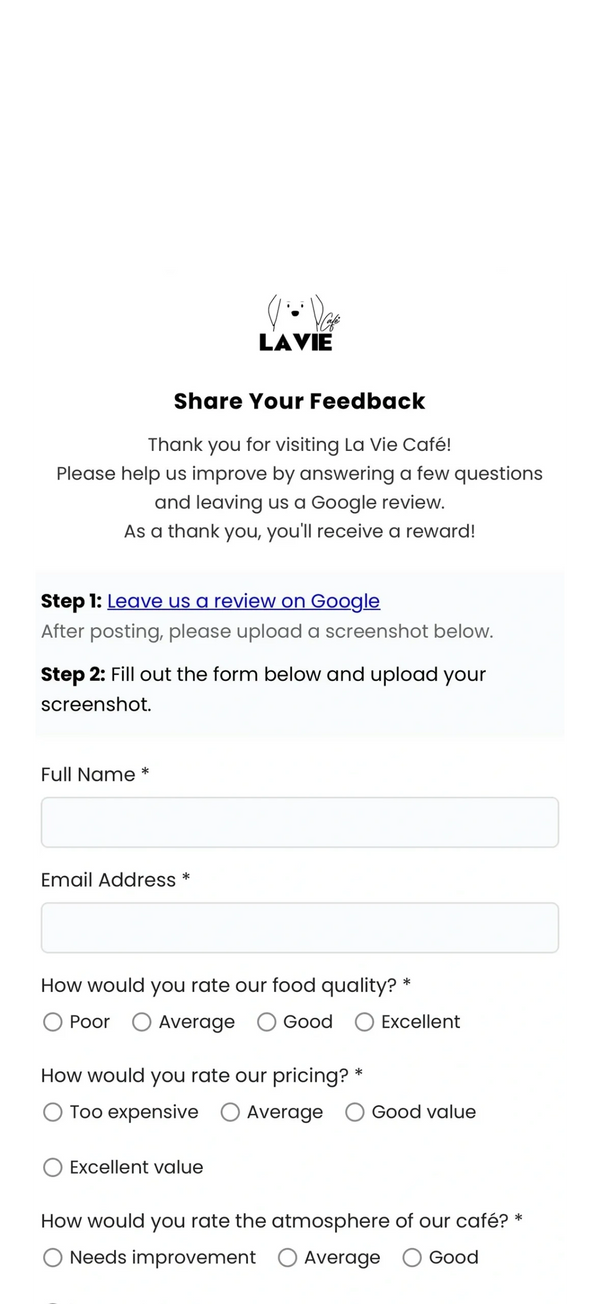 We value your opinion and strive to improve your experience at La Vie Café. This section allows you to share your feedback, suggestions, or concerns. Your input helps us enhance our services, refine our campaigns, and deliver the best possible experience for all our customers.